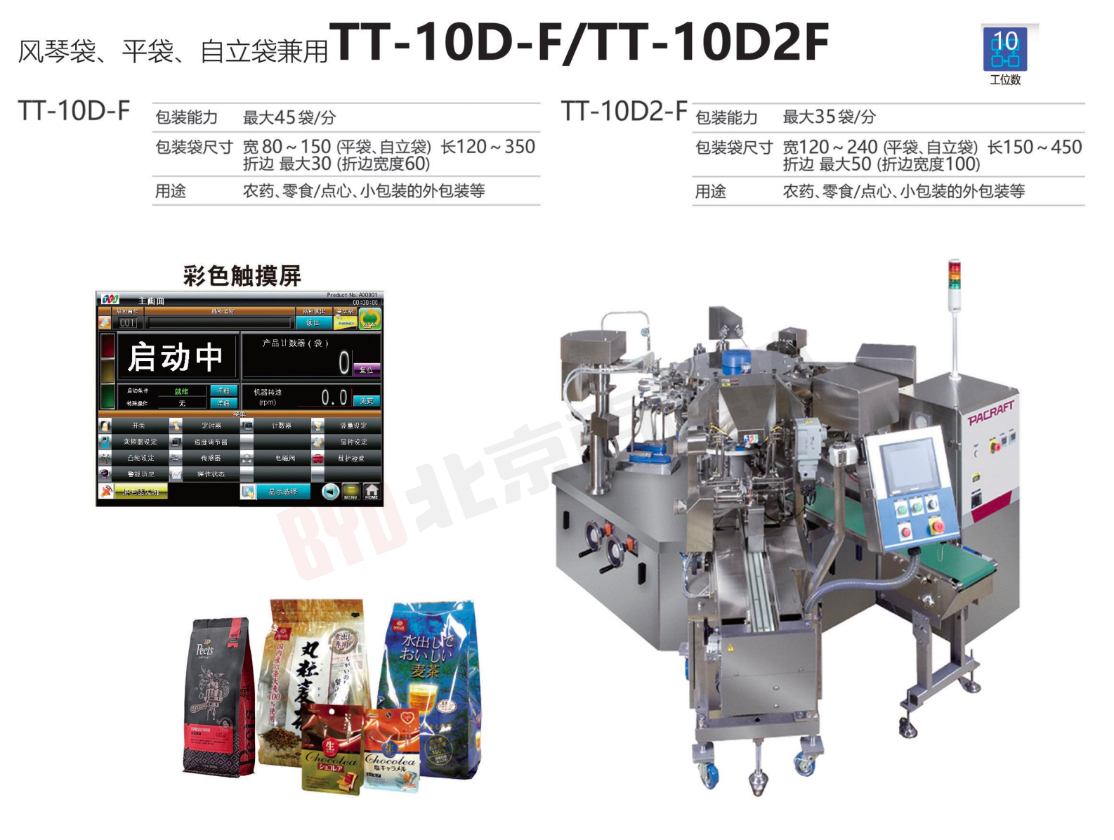 包装能力:最大45袋/分 包装袋尺寸:宽 80~150 (平袋、自立袋)长120~350折边 最大30(折边宽度60) 适用于:农药、零食/点心,小包装的外包装等
